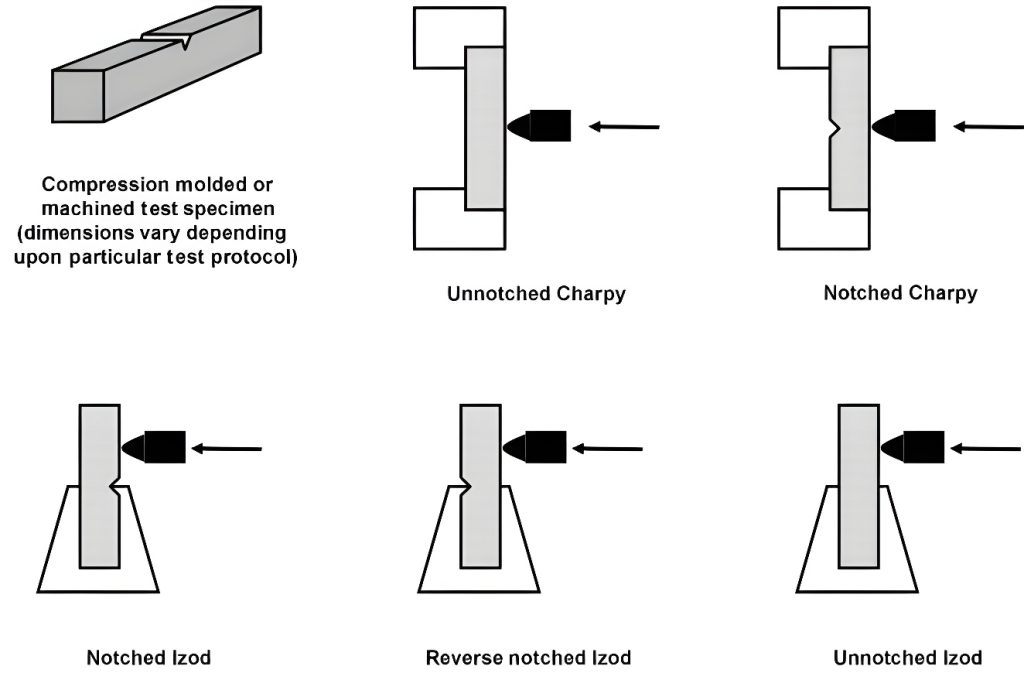 • تست ضربه (Impact Test): بررسی مقاومت پلاستیک در برابر ضربه با روش‌هایی مانند ایزود (Izod) و چارپی  (Charpy)طبق استاندارد ASTM D256 انجام میشود.