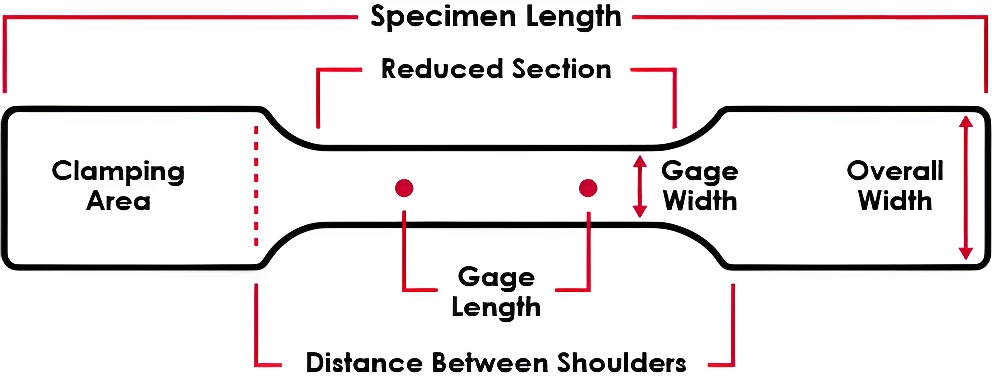 1. آماده‌سازی نمونه تست: نمونه پلاستیکی طبق استانداردهای بین‌المللی مانند ASTM D638 یا ISO 527 قالب‌گیری و آماده می‌شود .شکل نمونه معمولاً دارای یک ناحیه باریک میانی (Dog-Bone) برای جلوگیری از تمرکز تنش در لبه‌ها است.