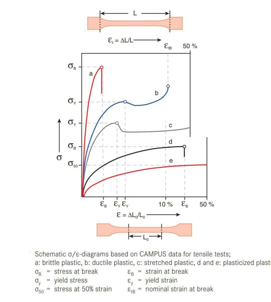 • تجزیه و تحلیل نتایج: نمودار تنش-کرنش (Stress-Strain Curve) رسم شده و رفتار پلاستیک بررسی می‌شود بطوری که پلاستیک‌های سخت، مقاومت کششی بالاتری دارند، در حالی که پلاستیک‌های نرم‌تر خاصیت الاستیکی بیشتری نشان می‌دهند.همان گونه که درشکل زیرمشاهده میشود نمودارa مربوط به پلاستیک سخت با تنش تسلیم وتنش نهایی بالاتر نسبت به سایر نمودارها است به عبارت دیگر هر چه تنش تسلیم ماده ای در نمودار آن بیشتر باشد مقاومت آن ماده در برابرازدیاد طول بیشتر وهمچنین مدول یانگ یا مدول الاستیسیته آن بیشتر میشود که در نمودارها نیز افزایش شیب نشان دهنده این موضوع است.
