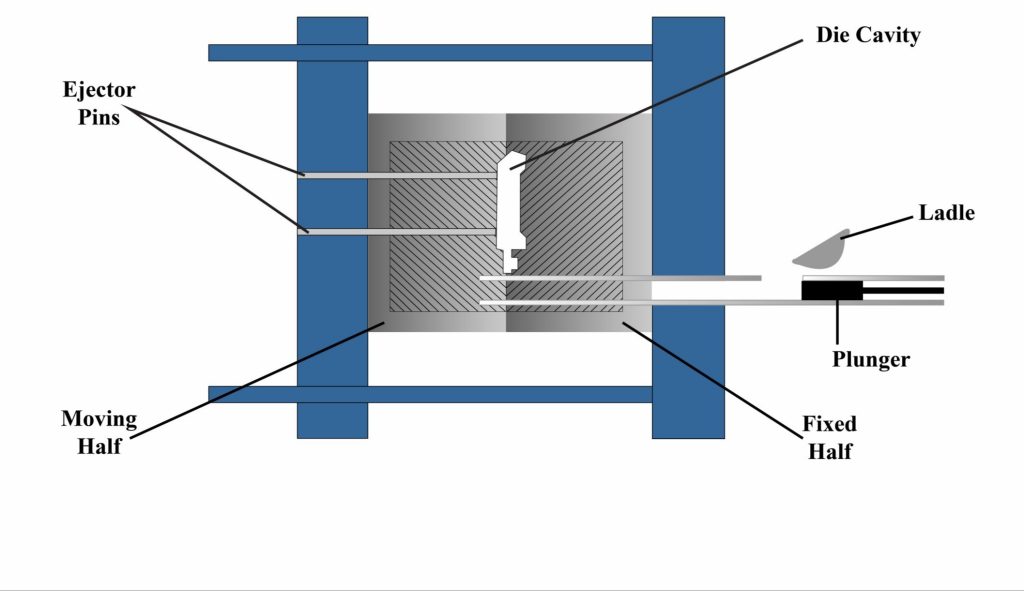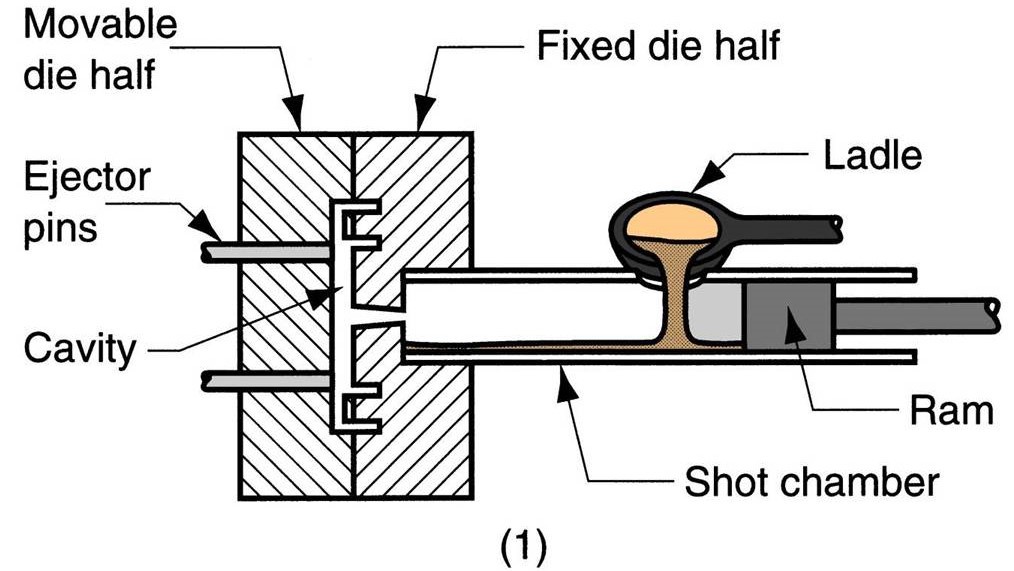 فلز مذاب بهصورت دستی یا اتوماتیک درون یک محفظه تزریق (Cylinder) ریخته شده و سپس پیستون آن را با فشار زیاد به داخل قالب تزریق میکند.