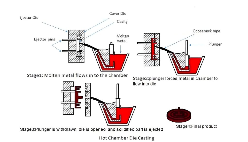 فلز مذاب داخل یک مخزن (کوره) نگهداری میشود و یک پیستون تزریقی، مذاب را از طریق نازل به داخل قالب هدایت میکند.