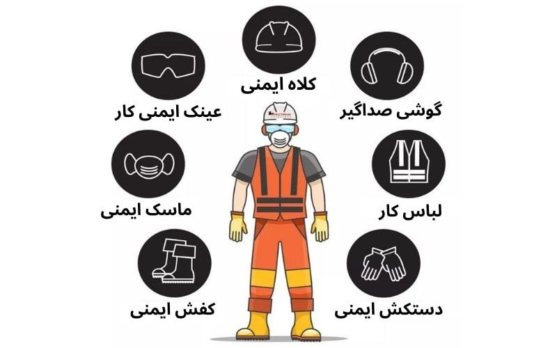بازرسی و نظارت بر تجهیزات ایمنی مانند کلاه، عینک، دستکش، ماسک و لباسهای محافظ