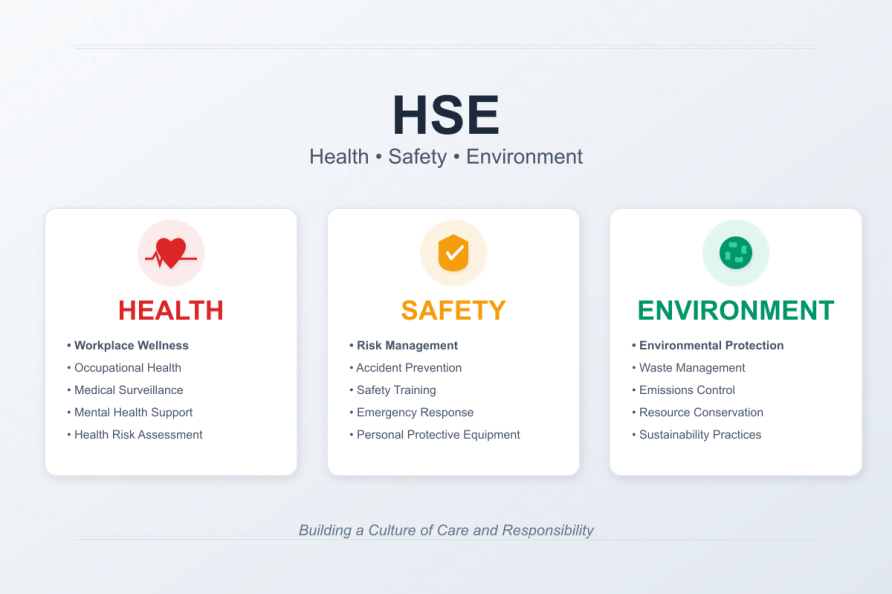 HSE مخفف Health, Safety, and Environment به معنای بهداشت، ایمنی و محیط زیست است. این سیستم مدیریتی، مجموعهای از اصول، مقررات و استانداردها را در بر میگیرد که هدف آن حفظ سلامت کارکنان، ارتقای ایمنی در محیط کار و کاهش اثرات زیستمحیطی فعالیتهای صنعتی و سازمانی است.
