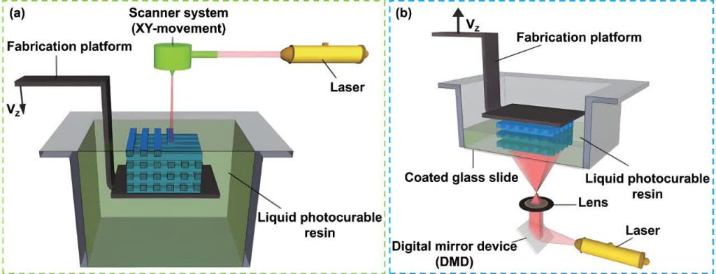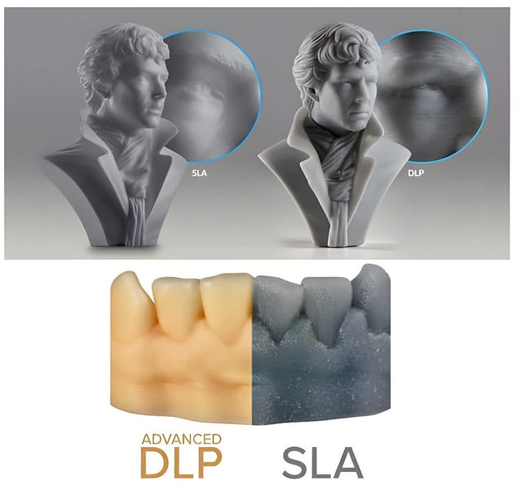 مزایا: از مزایا آن دقت بالا در چاپ جزئیات ، صافی سطح بسیار خوب، مناسب برای مدل‌های کوچک، مینیاتوری، جواهرات، دندان‌پزشکی و قطعات دقیق  و امکان چاپ چند مدل همزمان بدون کاهش زمان چاپ.