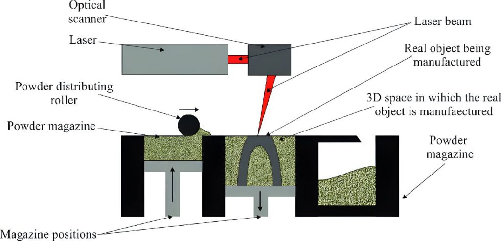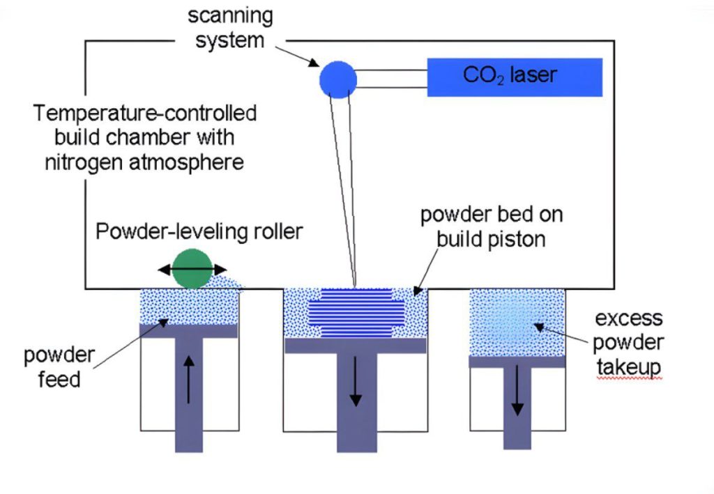 یک تیغه یا غلتک (Recoater) وظیفه دارد که یک لایه بسیار نازک از پودر (معمولاً با ضخامت 0.1 تا 0.15 میلی‌متر) را به‌صورت یکنواخت روی بستر ساخت پخش کند در نهایت لیزر CO₂ از طریق آینه‌های گالوانومتری هدایت می‌شود تا مطابق با طرح CAD، روی مقطع مشخصی از قطعه تابانده شود. در این فرآیند، ذرات پودر در مسیر لیزر تا حدی ذوب شده و به یکدیگر جوش می‌خورند، در حالی‌که ذوب کامل رخ نمی‌دهد (sintering).