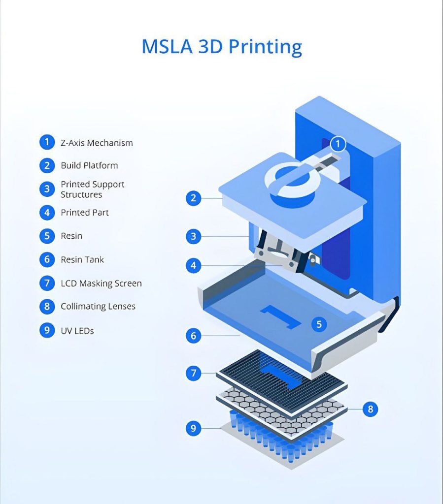 در فناوری چاپ سه‌بعدی به روش LCD که با عنوان MSLA نیز شناخته می‌شود، از ترکیب یک منبع نور UV و صفحه‌نمایش LCD برای شکل‌دهی به قطعه استفاده می‌شود. در این روش، ابتدا فایل سه‌بعدی مدل توسط نرم‌افزار مخصوص برش داده شده و به هزاران تصویر دوبعدی سیاه‌وسفید (نمایش لایه‌ها) تبدیل می‌گردد. سپس این تصاویر به دستگاه ارسال می‌شوند. دستگاه دارای مخزنی از رزین فوتوپلیمری حساس به نور UV است. صفحه ساخت دستگاه درون این مخزن قرار می‌گیرد و از پایین به سمت بالا حرکت می‌کند. در هر مرحله، صفحه ساخت تا ارتفاع مشخصی پایین می‌آید تا فاصله‌ی دقیق برای ایجاد یک لایه جدید فراهم شود.