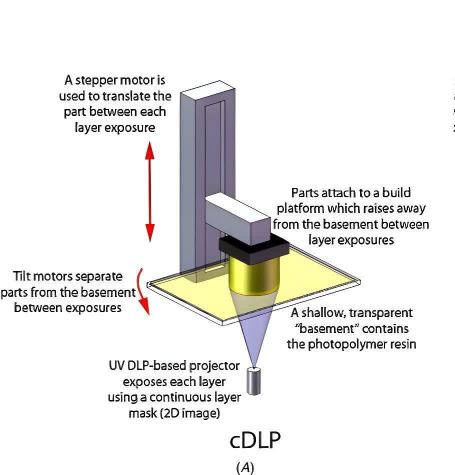 در CDLP، از یک منبع نوری دیجیتال برای پخت رزین استفاده می‌شود. فرآیند  بدین صورت هست که در کف مخزن رزین، یک پنجره نوری شفاف و نفوذپذیر به اکسیژن وجود دارد،یک لایه نازک از اکسیژن به طور مداوم به این پنجره تزریق می‌شود که یک منطقه مرده (Dead Zone) ایجاد می‌کند ، این ناحیه مانع از پخت رزین در نزدیکی پنجره می‌شود و اجازه می‌دهد که قطعه به‌صورت پیوسته از داخل رزین بالا بیاید سپس نور دیجیتال (UV) به طور مداوم در حال تابش به رزین است و قطعه بدون توقف ساخته می‌شود.
