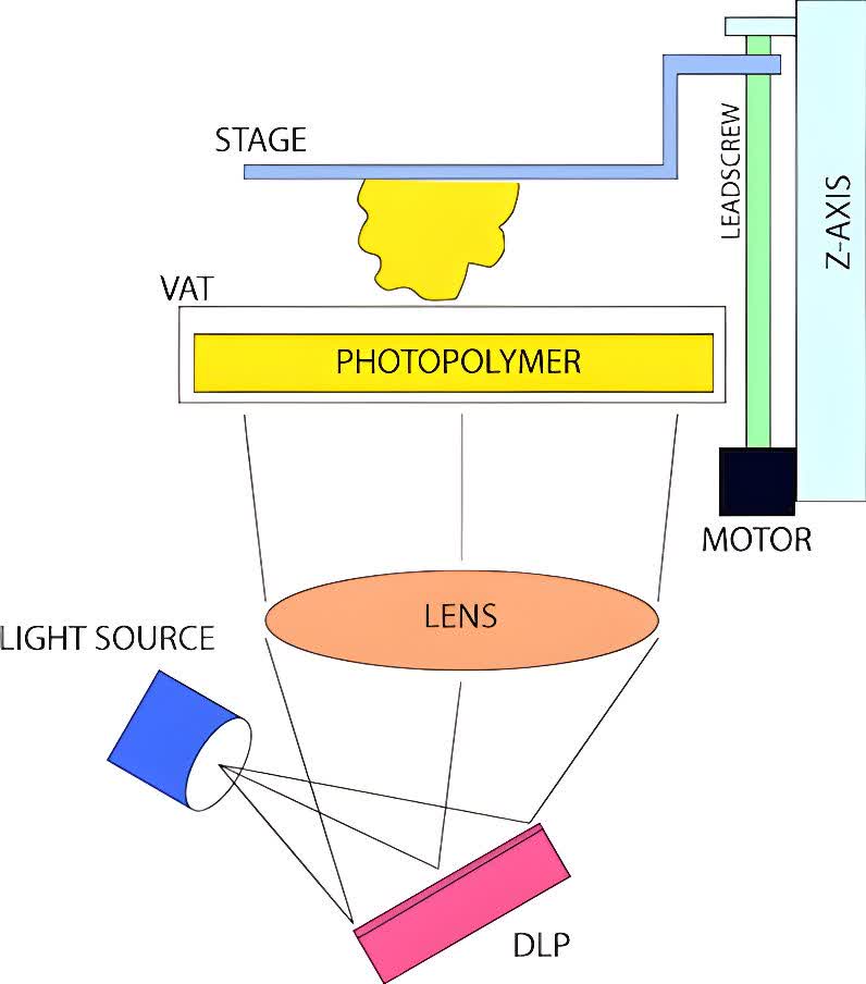 در زیر مخزن، نور UV توسط آرایه‌ای از LEDها تابانده می‌شود. این نور ابتدا از صفحه LCD عبور می‌کند. صفحه LCD دقیقاً مانند یک ماسک دیجیتالی عمل کرده و فقط بخش‌هایی از نور را عبور می‌دهد که مطابق با تصویر آن لایه هستند. نواحی‌ای که نور از آنها عبور می‌کند، باعث سخت شدن رزین در آن نقاط می‌شوند و بدین ترتیب لایه‌ای از قطعه شکل می‌گیرد. پس از آن، صفحه ساخت کمی بالا می‌رود تا رزین تازه جایگزین شود و آماده‌ی شکل‌گیری لایه‌ی بعدی گردد،این فرایند بارها تکرار می‌شود تا قطعه به‌صورت کامل ساخته شود. در نهایت، قطعه از صفحه ساخت جدا شده و نیاز به شست‌وشو (معمولاً با الکل ایزوپروپیل) و سپس پخت نهایی در معرض نور UV دارد تا به خواص مکانیکی نهایی خود برسد.