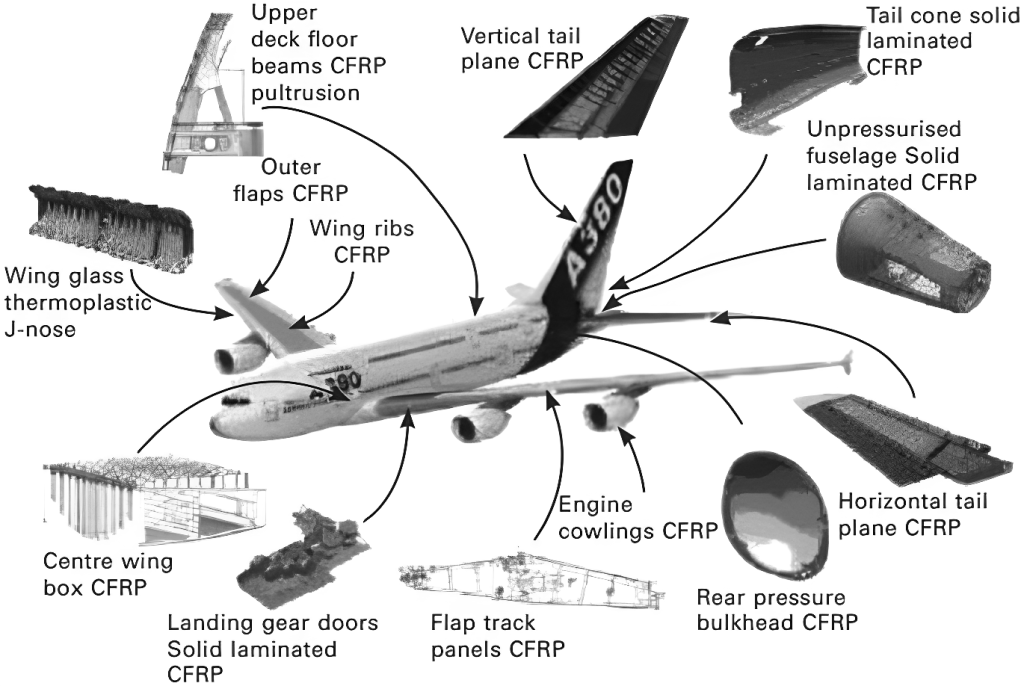 استفاده از کامپوزیت های تقویت شده با الیاف کربن در بدنه وبال هواپیما همچنین عایق صوتی کاور موتور هواپیما