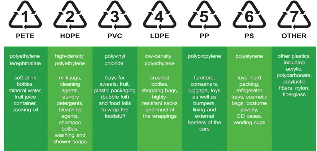 • پلی‌اتیلن ترفتالات (PET): یکی از رایج‌ترین پلاستیک‌های قابل بازیافت است و معمولاً در بسته‌بندی‌های نوشیدنی‌ها و مواد غذایی استفاده می‌شود. بازیافت PET به راحتی انجام می‌شود و می‌تواند به محصولات جدید مانند لباس‌های ورزشی، وسایل خانگی، و حتی مواد بسته‌بندی تبدیل شود.