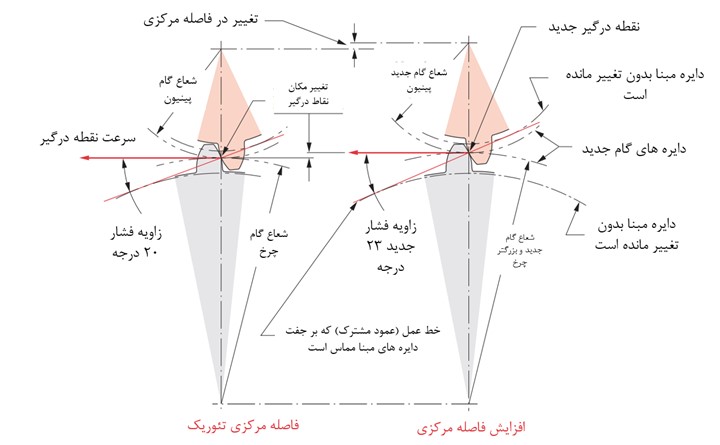 شکل زیر تاثیر تغییر فاصله محوری روی عملکرد چرخ دنده برای دندانه های اینولوت را نشان می دهد. مشاهده می شود که وجود اختلاف بین فاصله محورها، تنها زاویه فشار دندانه های درگیر را تغییر می دهد، اما همچنان محور های انتقال یا عمود مشترک ها از نقطه تماس دندانه ها عبور می کند که باعث می شوند نسبت سرعت ها ثابت بماند.