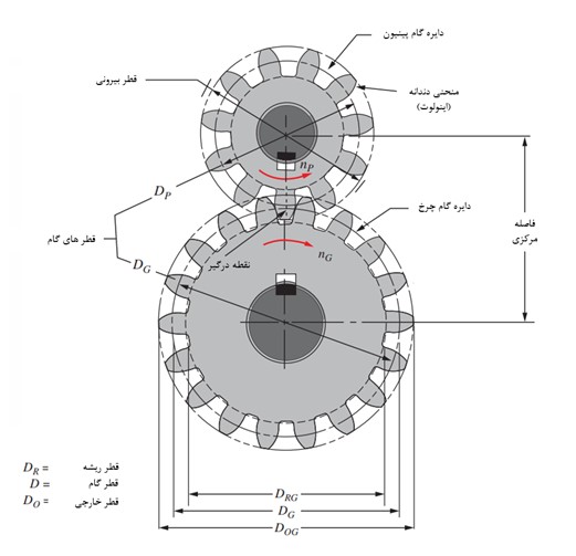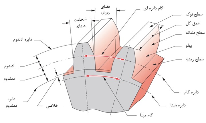 همانطور که پیش تر مطرح شد، شکل و هندسه پروفیل دندانه های چرخ دنده ها از اهمیت بالایی برخورد دار هستند چه که راندمان مکانیکی سیستم را تعیین می کنند. از این جهت به هندسه ی دندانه ها می پردازیم. اما ابتدا نیاز هست که درباره اجزای اصلی هندسی چرخ دنده ها توضیح داده شود.