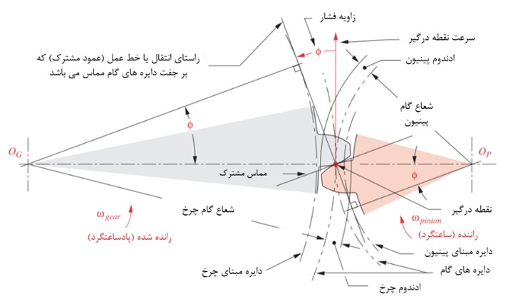 همانطور که در شکل زیر نشان داده شده است، در نقطه تماس دو دندانه یا pitch point می توان دو خط ترسیم کرد که یکی مماس بر جفت سطوح تماس که مماس مشترک نامیده می شود و یکی دیگر که عمود بر مماس مشترک می باشد که عمود مشترک (یا محور انتقال) نامیده می شود در نظر گرفت. محور انتقال همواره از نقطه تماس دو دندانه  pitch pointعبور می کند. اگر نقطه آغاز درگیری و پایان درگیری جفت دندانه مجاور با محنی اینولوت را در نظر بگیریم، مشاهده می شود که محور های انتقال جفت دندانه ها از یک نقطه عبور می کند که این امر همان ویژگی اصلی منحنی اینولوت برای دندانه ها را به دنبال دارد.. زیرا این خاصیت باعث می شود نسبت سرعت ها ثابت بماند. لذا از این رفتار در درگیری دندانه های اینولوت نتیجه گیری می شود که: در تمام لحظات درگیری دندانه های اینولوت و انتقال قدرت از چرخ دنده ورودی به چرخ دنده خروجی، عمود مشترک ها یا محور های انتقال همواره باید از یک نقطه ی ثابت تماسی به نام pitch point بگذرد. خط عمل line of action، خط همان راستای مماس مشترک می باشد (مطابق شکل) است و به فاصله بین نقطه ی ابتدایی و انتهایی درگیری بر روی خط عمل، طول عمل یا Length of Action گفته می شود. درواقع نقطه درگیر دو دندانه در حین درگیری، از روی این خط عبور می کند.