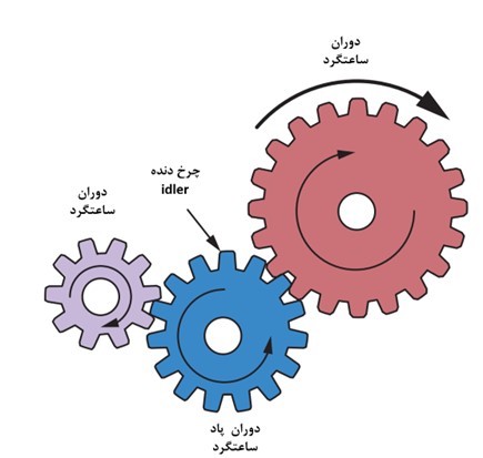 یکی دیگر از ویژگی های سیستم های چرخ دنده ای، معکوس کردن جهت دوران محور ها می باشد. به طوری که اگر یک شفت به صورت ساعتگرد دوران کند، با انتقال حرکت توسط چرخ دنده، جهت دوران شفت دیگر پادساعتگرد می شود. برای نگه داشتن جهت دوران از چرخ دنده واسط به نام idler استفاده می کنند که مطابق  شکل زیر می تواند قرار بگیرد.
