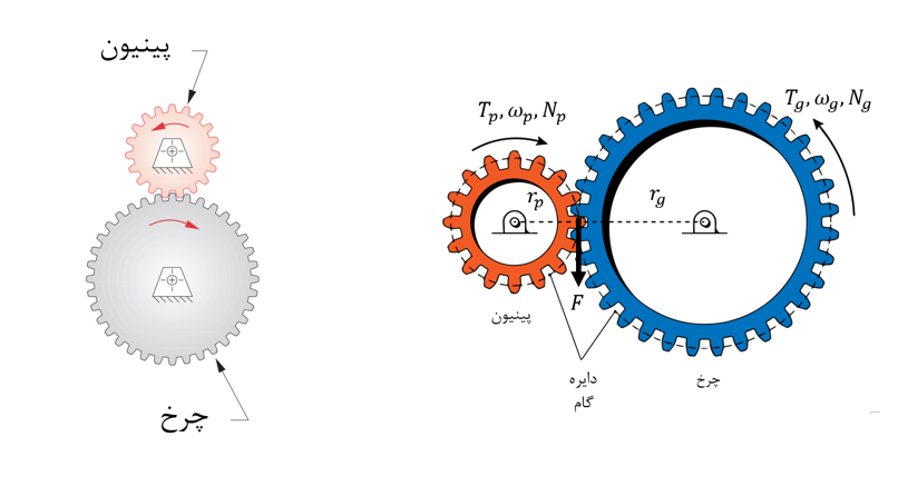 در یک مکانیزم ساده چرخ دنده ای، که دو چرخ دنده با هم درگیر شده باشند، برحسب قرارداد چرخ دنده ی کوچک را پینیون  (pinion) و چرخ دنده بزرگ را چرخ یا همان چرخ دنده (gear) می نامند. یا در ادبیاتی دیگر، چرخ دنده ها را تحت عنوان”راننده” یا (driver) – که معمولا به موتور وصل می شود و ورودی می باشد  – یا “رونده” یا (driven) – چرخ دنده ای که توسط چرخ دنده راننده یا ورودی رانده می شود – می نامند. اصلی ترین ویژگی مکانیزم های چرخ دنده ای تولید “مزیت مکانیکی” است. بدین معنا که طبق شکل زیر، اگر چرخ دنده با گشتاور  و سرعت زاویه ای  چرخ دنده ی پینیون را با گشتاور   و سرعت زاویه ای  را به حرکت دراورد، نیروی F مماس بر دایره های گام چرخ دنده ها به صورت مشترک که ناشی از تماس و درگیری دندانه ها می باشد، پدیدار می شود. دایره ی گام، دایره ای فرضی است که نقطه ی تماس دندانه ها روی آن می باشد و در ادامه معرفی خواهد شد.