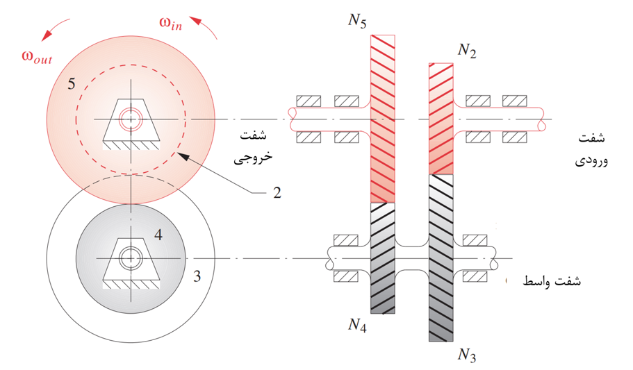 توجه داشته باشیم که در مجموعه مرکب زیر، چرخ دنده 2 چرخ دنده 3 را به حرکت در می آورد. پس 2 = راننده، 3 = رونده. به دلیل اینکه چرخ دنده 3 که بر روی شفت واسط قرار دارد به حرکت در آمده است، شفت واسط نیز شروع به دوران می کند و چرخ دنده 4 نیز همراه با آن حرکت می کند. لذا در جفت چرخ دنده ای 4 و 5، چرخ دنده شماره 4 راننده و شماره 5 رونده می شوند.